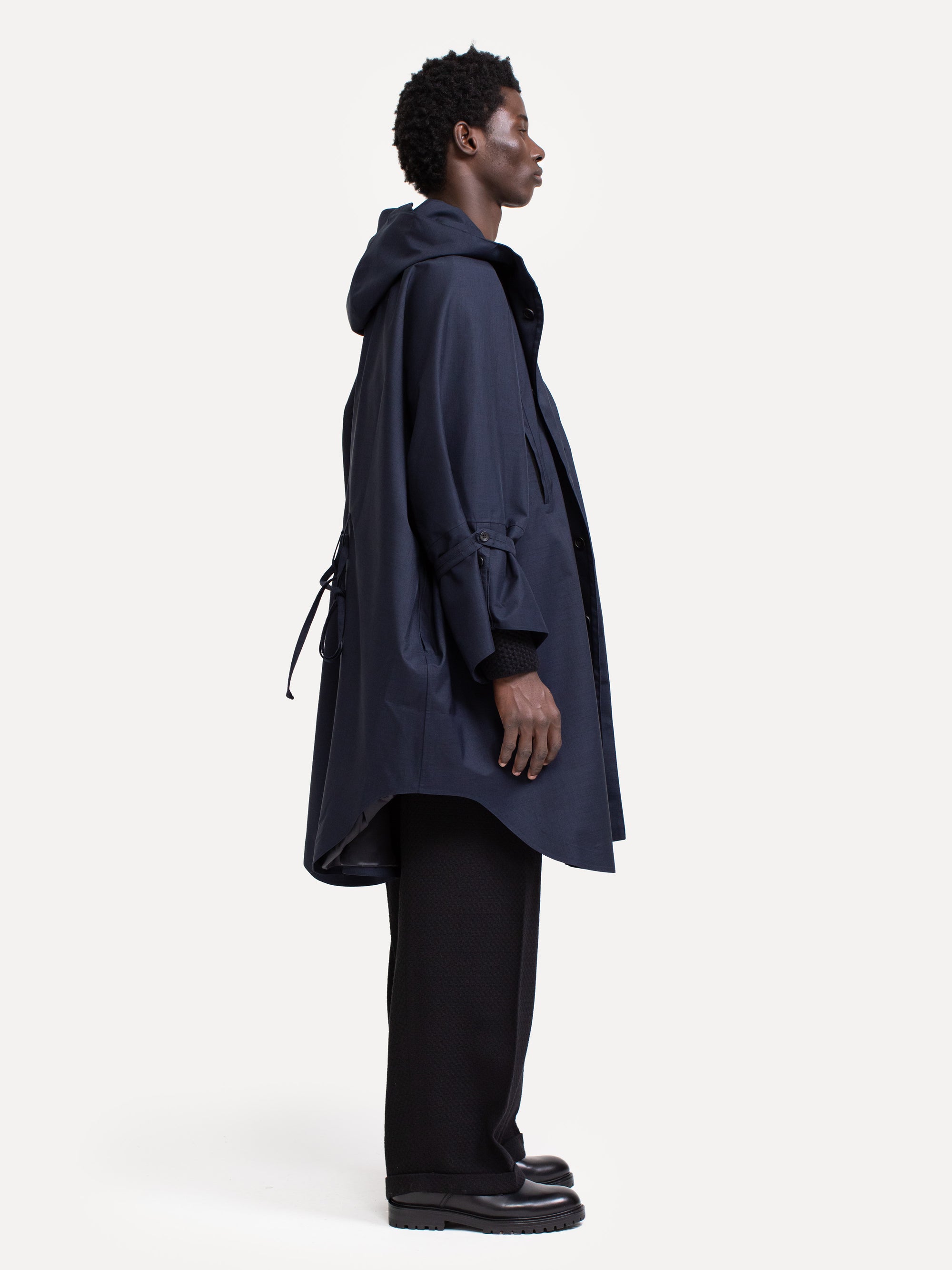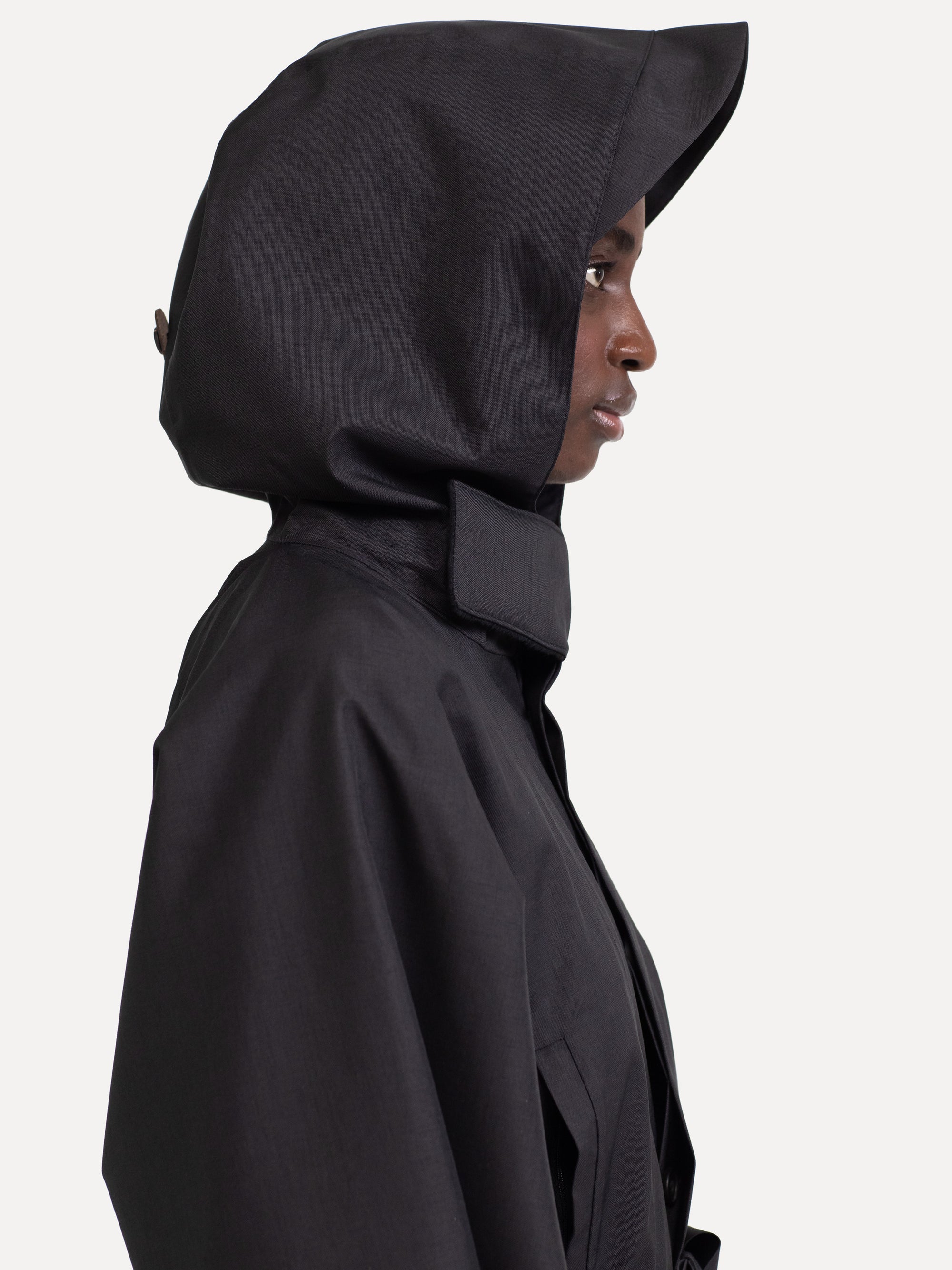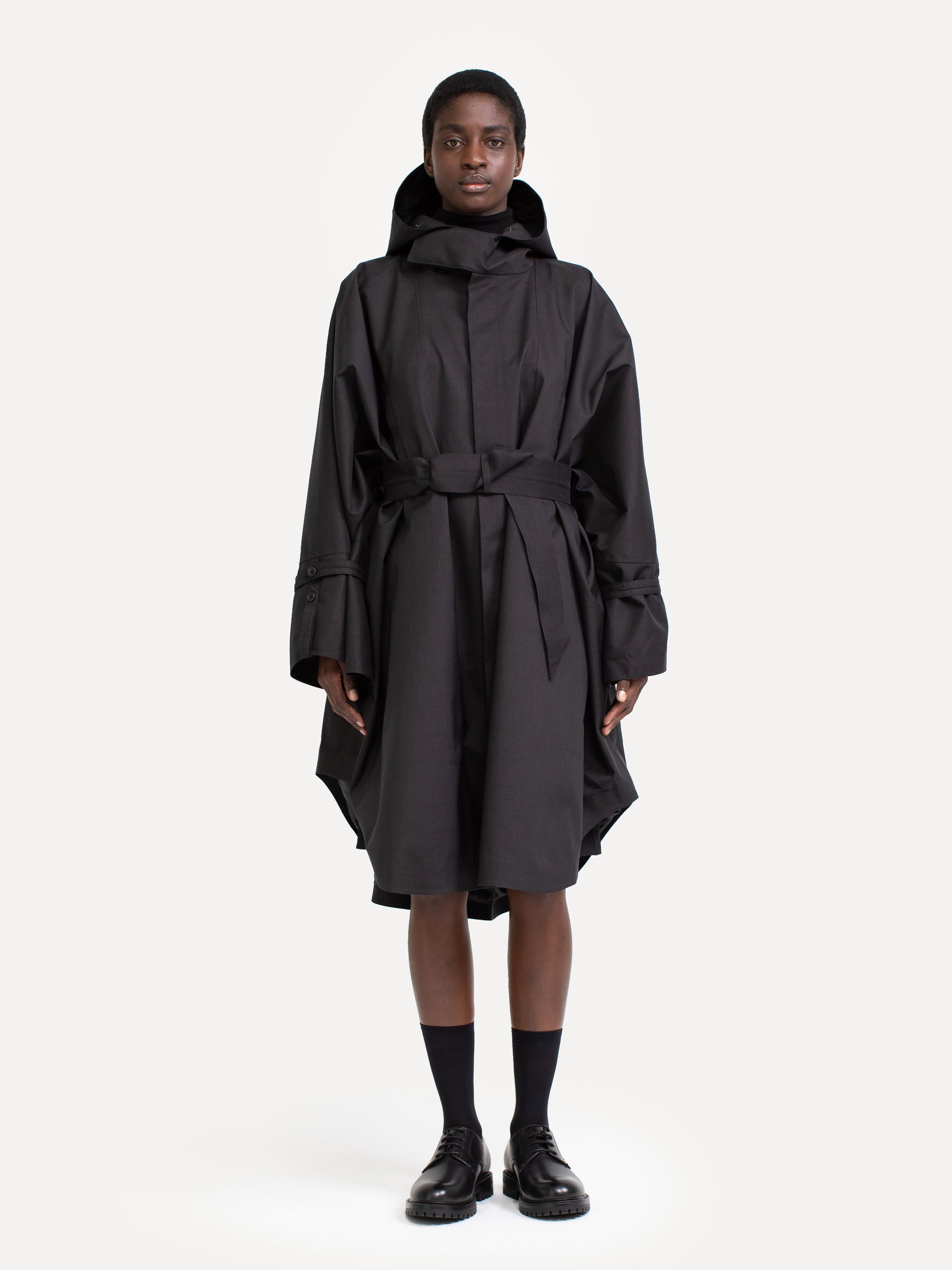 The style Raincho is a technical coat in an oversized fit designed for both men and women. The coat is made from Japanese recycled polyester, is 100% water- and windproof and breathable, has a fixed hood and comes with a lightweight polyester and viscose lining to enhance breathability of the coat. The collar lining has cashmere for an extra soft feeling. The coat can be worn with or without the included belt.