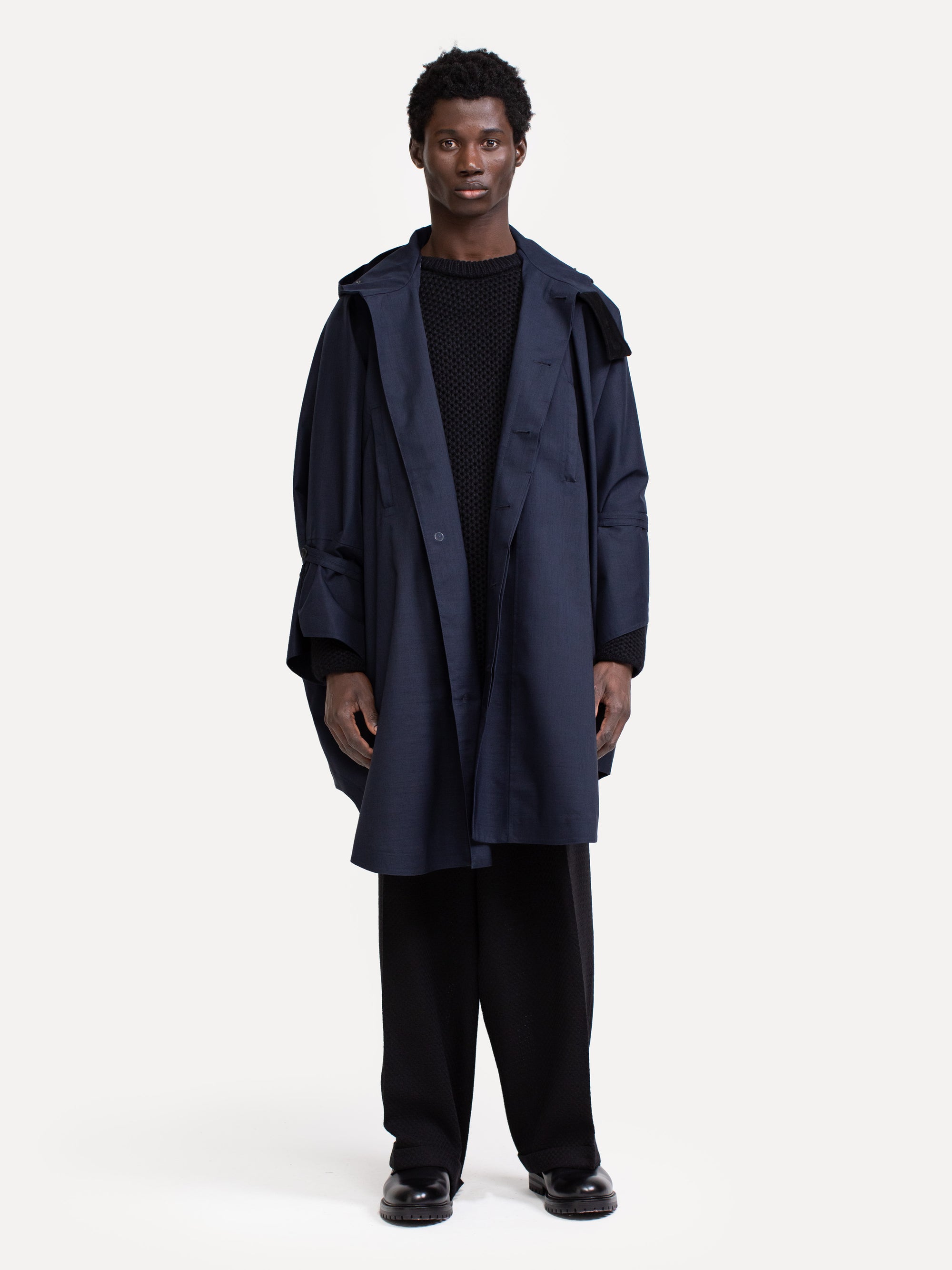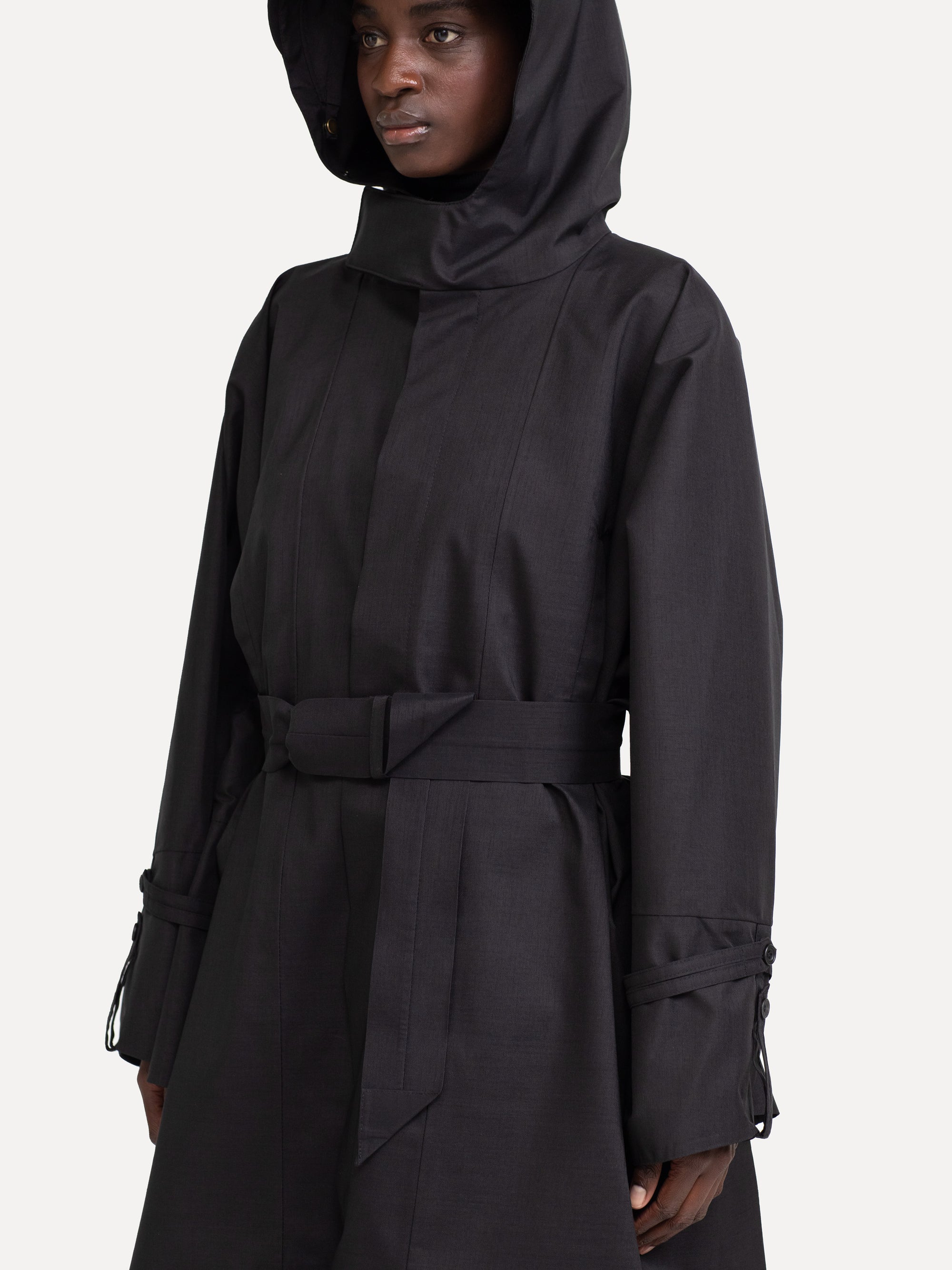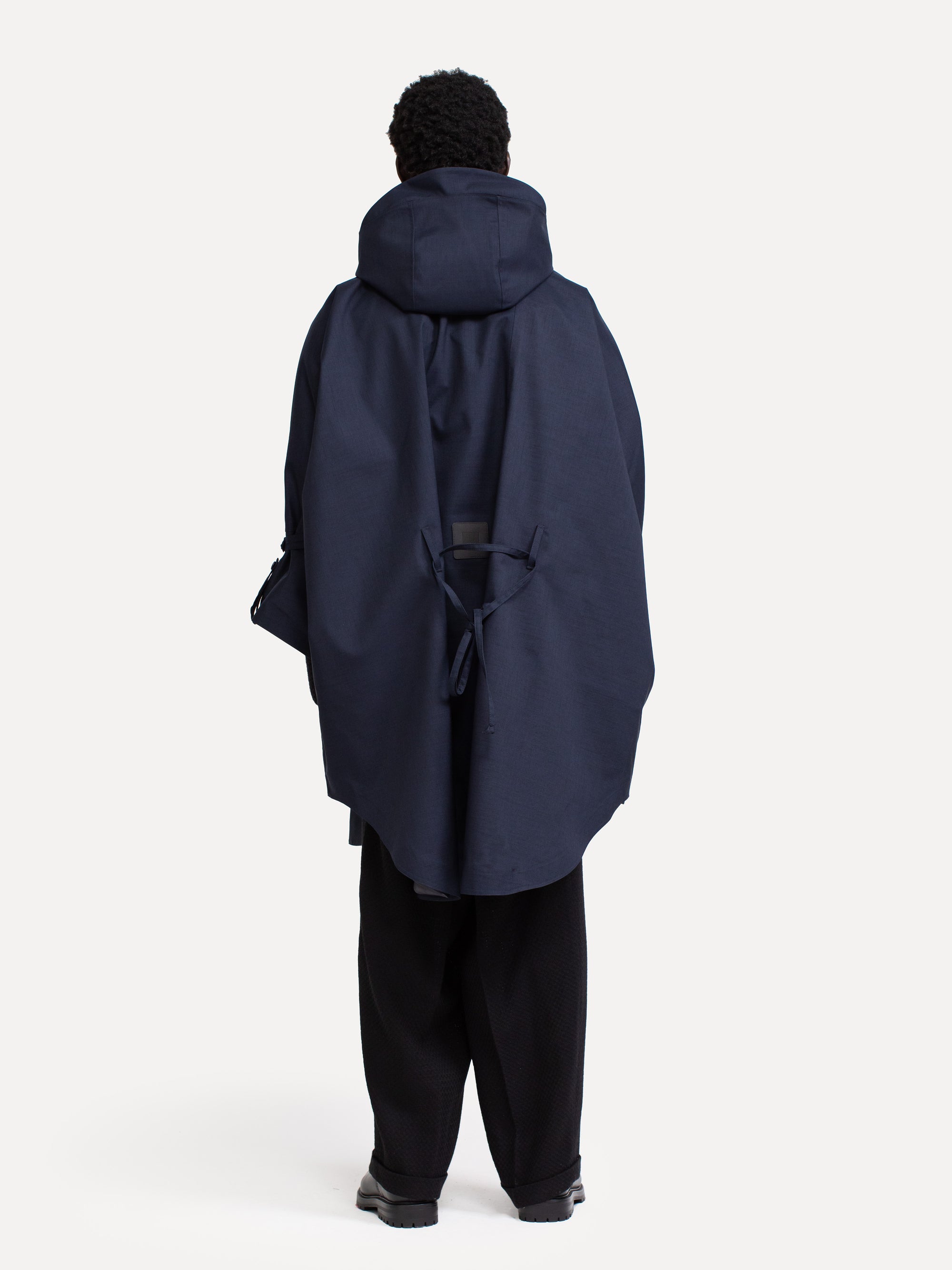 The style Raincho is a technical coat in an oversized fit designed for both men and women. The coat is made from Japanese recycled polyester, is 100% water- and windproof and breathable, has a fixed hood and comes with a lightweight polyester and viscose lining to enhance breathability of the coat. The collar lining has cashmere for an extra soft feeling. The coat can be worn with or without the included belt.